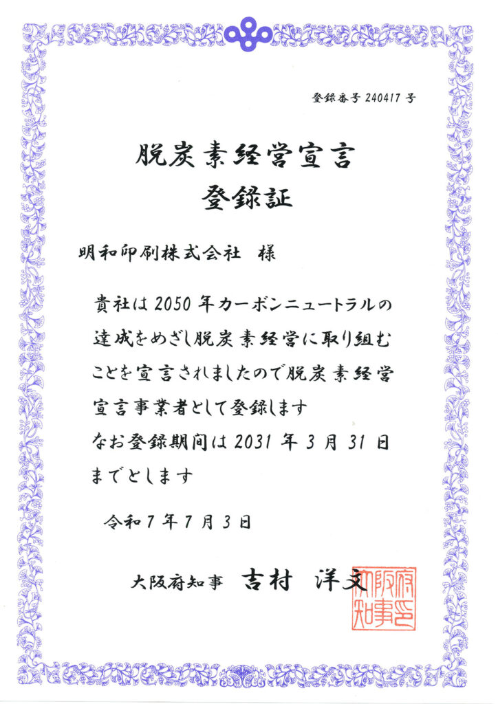 明和印刷株式会社は、大阪府の「脱炭素経営宣言」事業者として登録されました。この制度は、CO₂排出削減に向けて積極的に取り組む企業を府が認定するもので、持続可能な社会の実現に向けた重要な一歩となります。